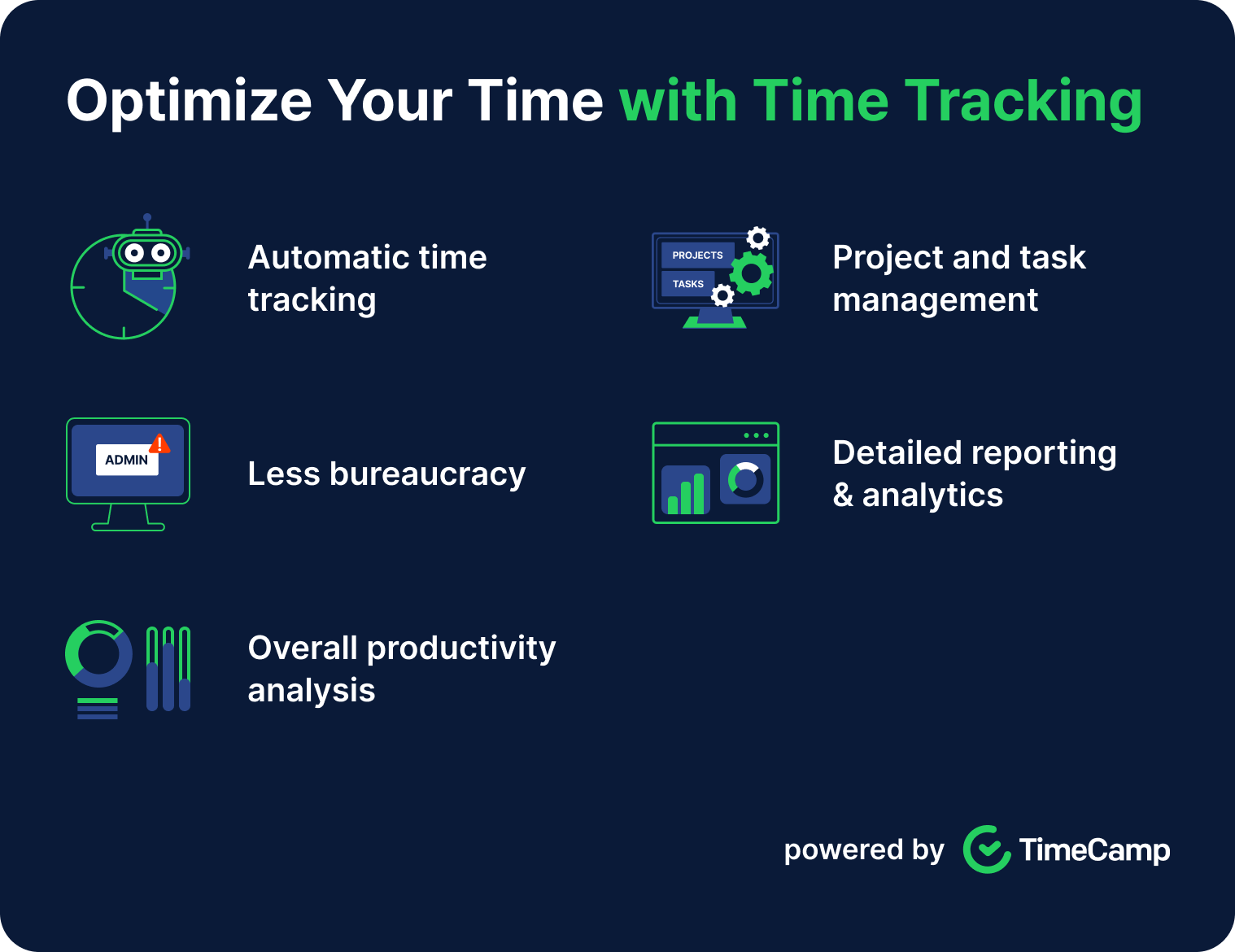 One tool that makes this easier is TimeCamp, a time tracking software designed to help you take control of your schedule. With TimeCamp, you can track your activities effortlessly, gain insights into your productivity, and align your day with your deepest priorities.
