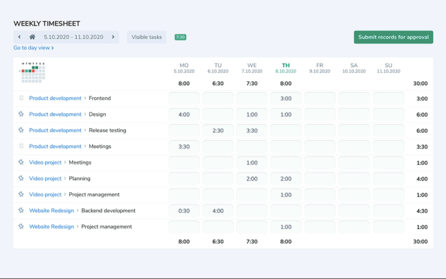 2. Time tracking software with timesheets and more advanced functionalities that let you track work progress in real-time (a web app, desktop apps, or mobile app),