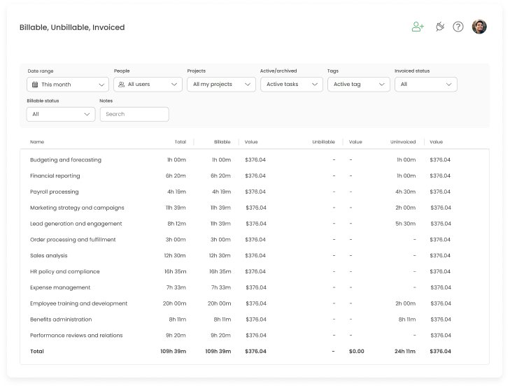 Pro tip: Choose a time tracking app that allows you to create invoices based on billable hours and specific billing rates. This will help you ensure that all the billable hours are invoiced and save you time doing it manually.