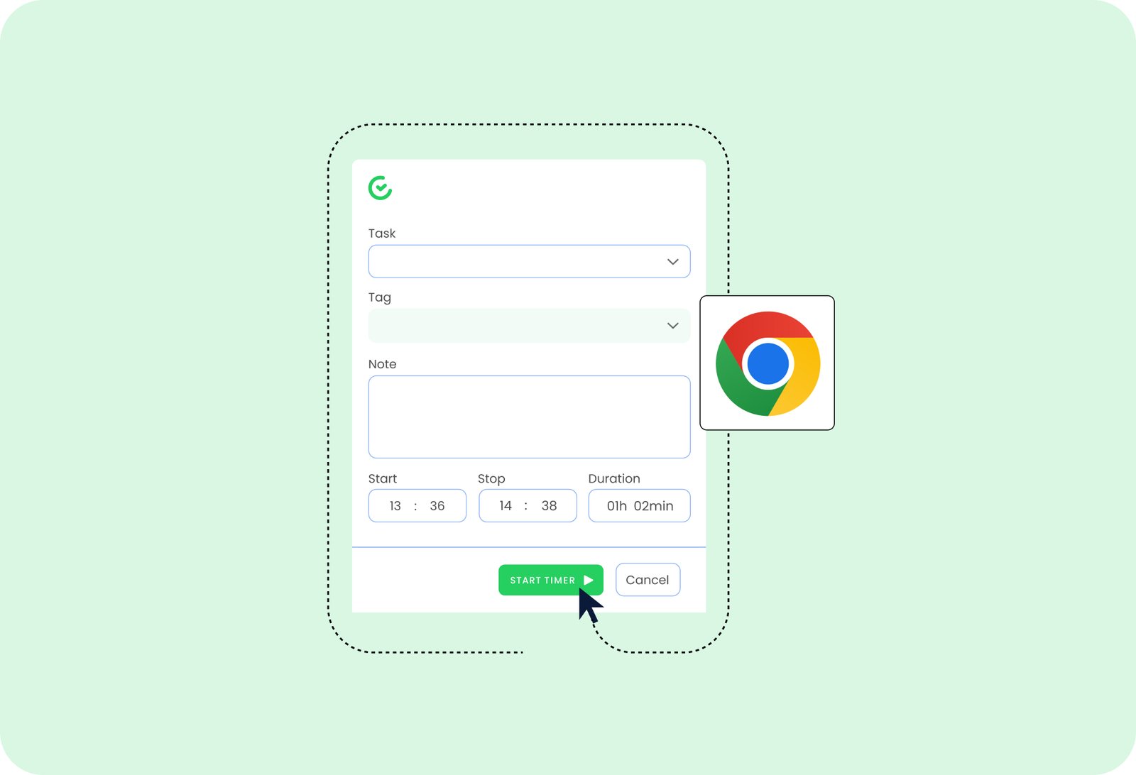 Another alternative is a manual time entries input. You can choose a specific start and stop time for your task. It will not be restricted to the web page you work on, so you can freely switch between tabs and apps!