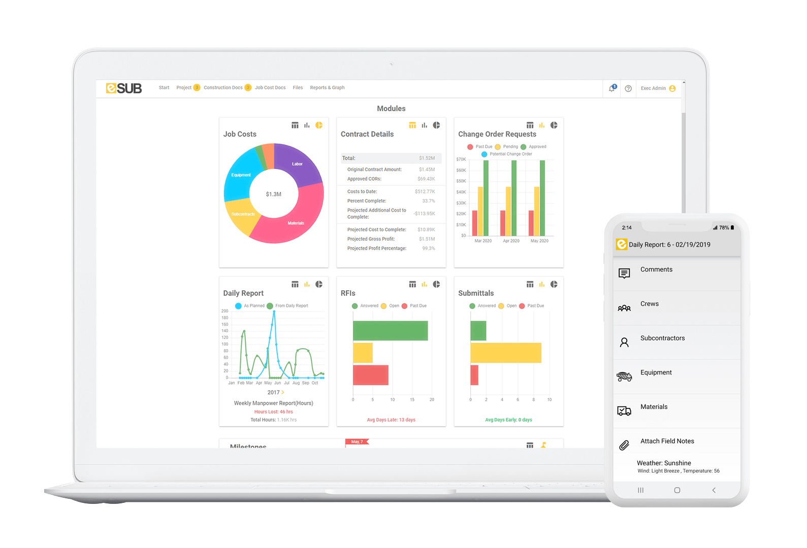 As in any other project management software, you can track the time and progress of your projects. Additionally, ESub enables you to easily enter data, site events, labor activities, material costs, workforce information, and more into a fully searchable database updated in real-time.