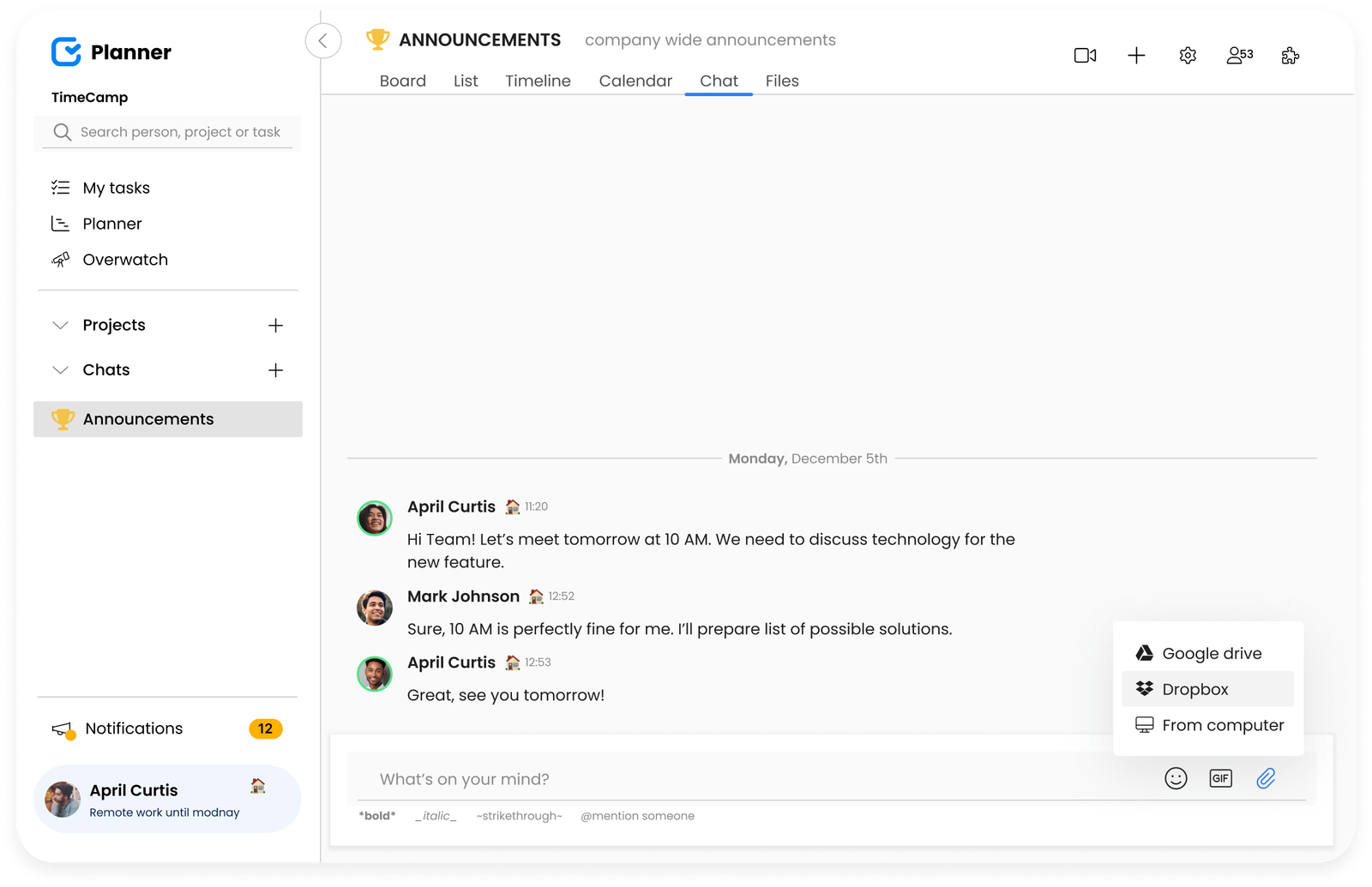 Besides robust project management features, TimeCamp Planner also enables collaboration and open communication. Team members can discuss general issues in group chats or get more specific in private messages. Using a single tool to report progress helps teams take accountability and ensures their continuous improvement.