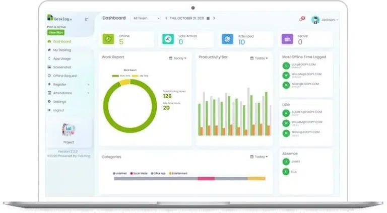 Desklog dostarcza wglądu w postęp projektów w czasie rzeczywistym poprzez integracje z narzędziami takimi jak Jira i ClickUp. Ponadto automatyzuje rejestracja obecności i nieobecności pracowników, oferując elastyczne zasady urlopowe.