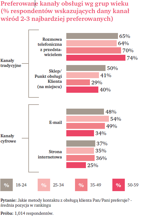 a. wieku: osoby w przedziale od 50 do 59 lat rzadziej wybierają kanały cyfrowe, takie jak e-mail czy stronę internetową, ale zazwyczaj wykorzystują rozwiązania tradycyjne. Klienci od 18 do 49 lat częściej łączą więcej kanałów, korzystają z maili, strony www, ale nie rezygnują tym samym z możliwości rozmowy telefonicznej (źródło: Klient w Świecie Cyfrowym, PwC, 2016, wykres poniżej).