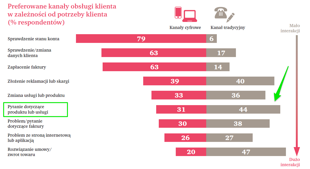 b. Specyfiki problemu: np. w przypadku, gdy potencjalny klient chce zapytać o produkt lub usługę (podczas pierwszej styczności z firmą), więcej osób wybiera kanały tradycyjne (źródło: Klient w Świecie Cyfrowym, PwC, 2016, wykres poniżej).