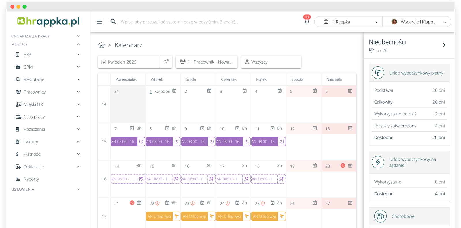 HRappka to rozbudowane narzędzie HR – nie tylko do ewidencji czasu pracy, ale pełen ekosystem: od rekrutacji przez onboarding, legalizację zatrudnienia cudzoziemców, kadry i płace, e-urlopy, aż po portal pracowniczy i rozliczanie delegacji.