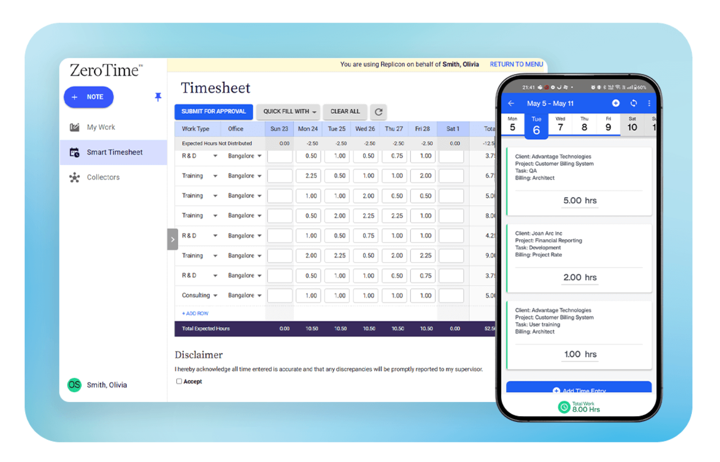 • Zarządzanie timesheetami i akceptacje: Umożliwia obsługę wielu kart czasu pracy oraz ich sprawne zatwierdzanie w dogodnym momencie.