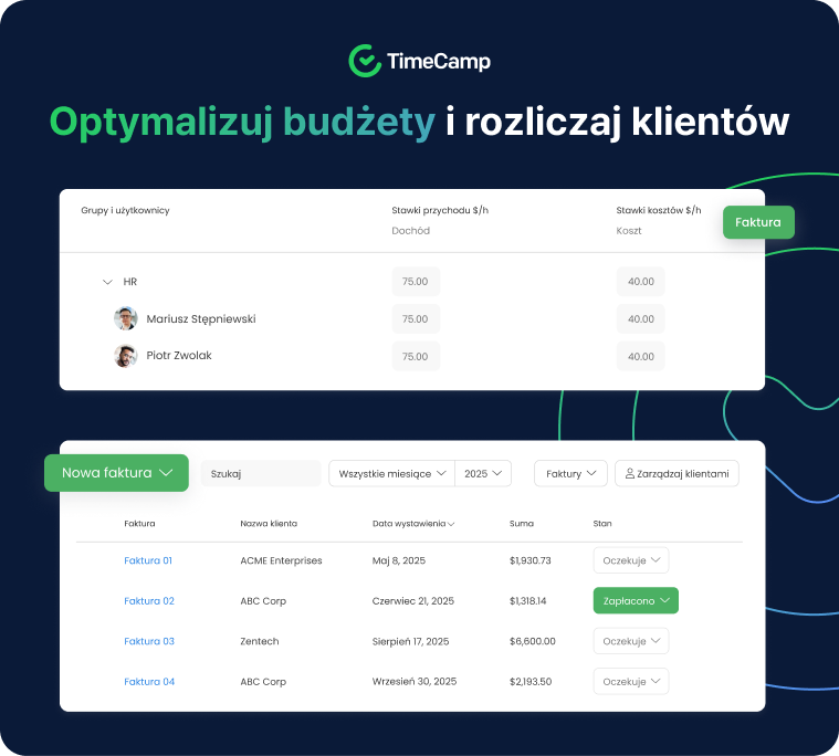 Śledź czas w projektach i zadaniach, twórz raporty i rozliczaj klientów — wszystko w jednym narzędziu.