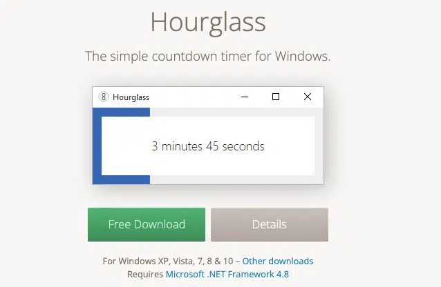 Hourglass to minimalistyczna aplikacja do śledzenia czasu w systemie Windows. Oferuje szybki start, różne sygnały dźwiękowe, inteligentne pole wprowadzania oraz możliwość wyboru motywów.