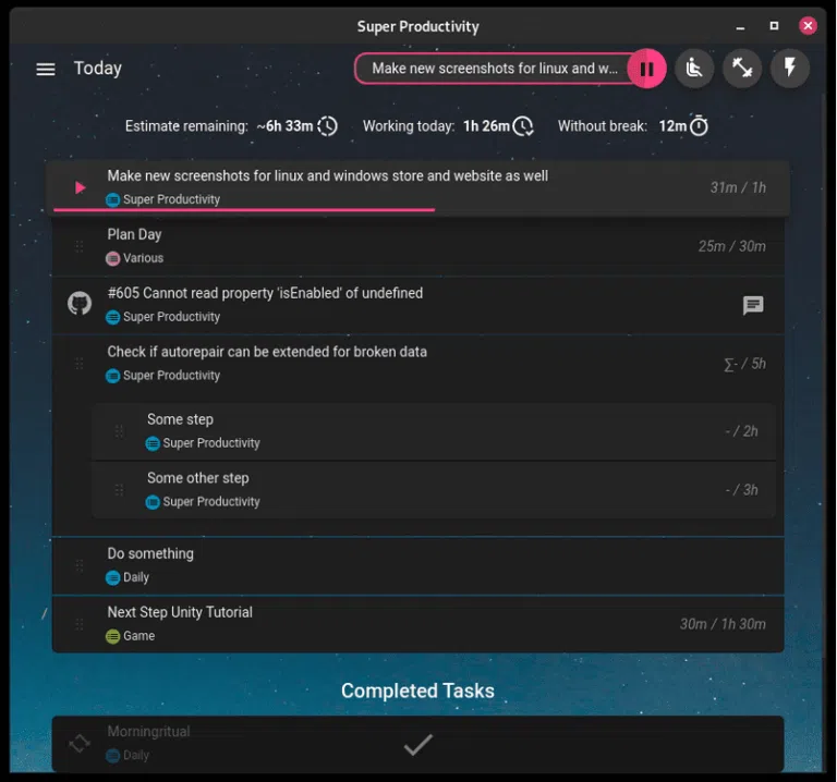 Super Productivity to samodzielna aplikacja do zarządzania projektami, idealna do użytku osobistego. Stworzona z myślą o programistach i projektantach, oferuje integrację z Jira i Github – umożliwia automatyczne importowanie zadań, planowanie lokalne, tworzenie raportów z pracy i powiadomienia.