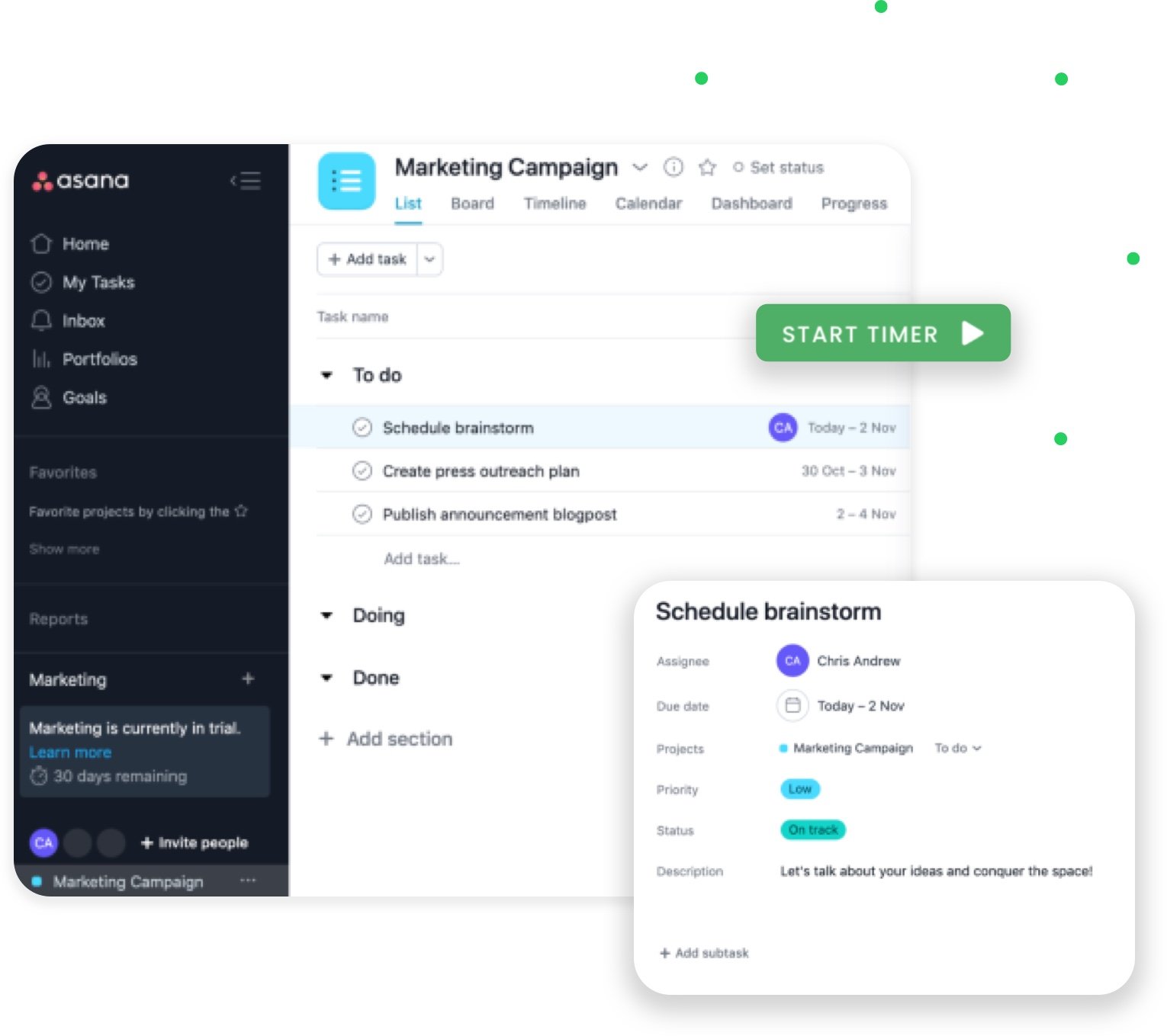 TimeCamp integrates directly with 30+ tools for project management, sales, CRM, accounting, and many more, like Trello, JIRA, Asana, Monday, Clickup, Zendesk, Salesforce, or AzureDevOps. It mostly allows you to track time directly from your project management tools, implementing a time tracking button into the task view of your favorite app.